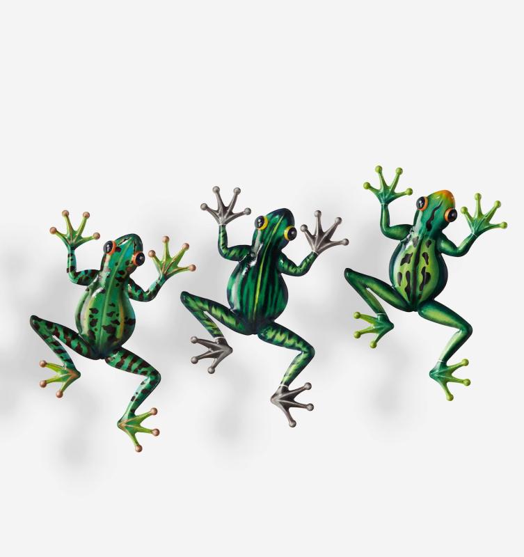 Bring the best of garden nature into your space and onto your walls with this 3D Frog Wall Decor. Features a sculpted metal frog-shaped design with black motifs and a realistic green painted finish. Hanging hardware attached to the back. Available in 3 assorted styles. Metal.