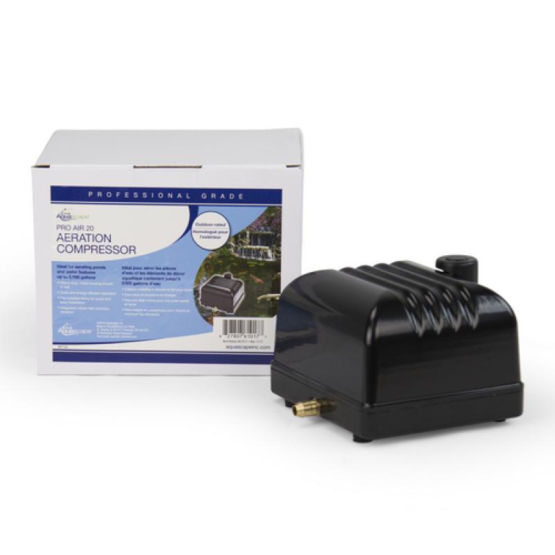 The Aquascape Pro Air 20 Aeration Compressor is the ideal compressor for aerating ponds and water features up to 5,000 gallons. The unit can be combined with aeration tubing and an aeration diffuser to supply dissolved oxygen directly to pond water, helping all biological processes and ensuring healthier water, fish, and plants. The outdoor-rated, 15-watt compressor provides quiet and energy-efficient operation, and the heavy-duty metal housing is weather resistant, guaranteeing year after year of reliable aeration. Integrated rubber feet located on the bottom of the compressor minimize vibration, and a pre-installed 3/8” outlet fitting makes installation quick and easy. The Pro Air 20 Aeration Compressor is ideal for ponds with a maximum depth of 6.5′, and the unit has a maximum air flow rate (loaded) of .71 CFM (20 liters/min) and a maximum air depth of 2.90 psi (0.20 kgf/cm2). The aeration compressor can also be used during winter months, when bubbles and water movement created at the surface help to maintain a small opening in the ice for oxygenation. Aquascape Pro Air 20 Aeration Compressors carry a 3-year limited warranty.