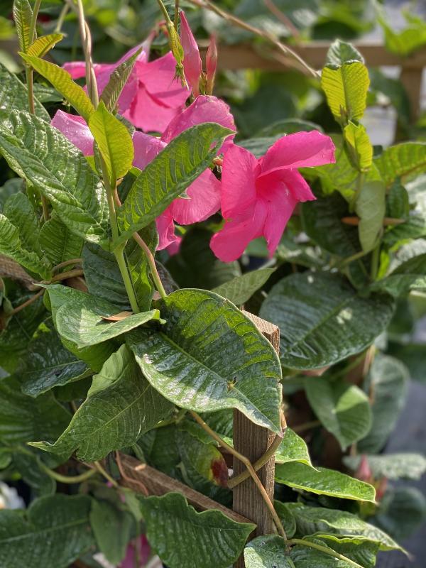 color in your landscape this summer by growing a Mandevilla vine up a trellis,