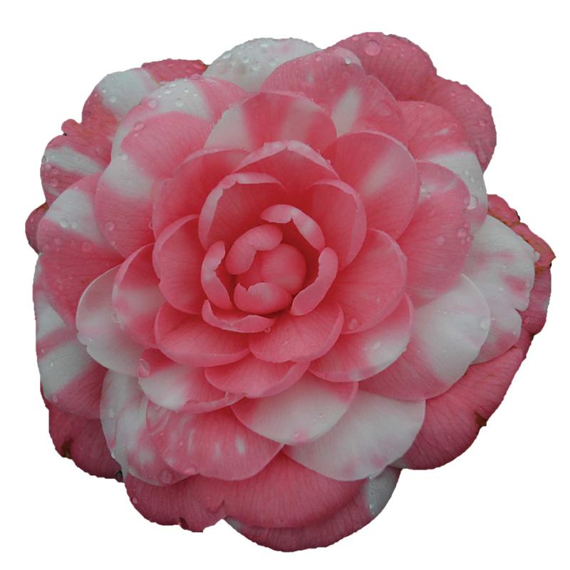 Variegated bloom. Rose pink and white formal double blooms. Medium upright compact growth. Nature height 6ft - 10ft, width 4ft = 6ft. **Variegated blooms are likely, but are not guaranteed**