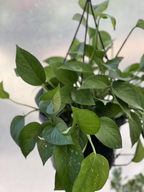 As a houseplant, pothos foliage stays small at around three and one-half inch long, oppositely arranged along a manageable trailing vines. Pothos do best in bright, diffuse light, which might be found indoors near a window or on a patio shaded by trees. Epipremnum does well in a hanging basket to show off its graceful vines, or in a regular pot centered on a plant stand. This plant also does well when trained up a moss totem which allows the roots to grow into the medium.