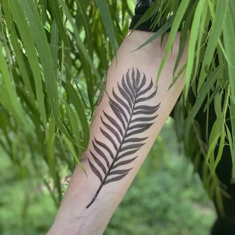 Palm Leaf temporary tattoo. Designed with naturally flowing dark leaves with fine lines. This tat pairs perfectly with our Tropical Floral tat. The length of this tat is 6.75 inches and the width is 2.75 inches. Lasts 2-5 days • Water-resistant • Comfortable • Skin Safe All original designs by Allison Wilcoxen in Austin, Texas.
