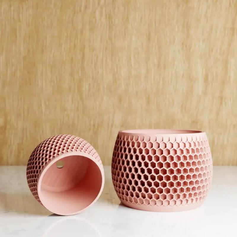 The Honeycomb Planter, inspired by nature, boasts a beehive-like texture, reflecting the efficiency of bees. Its elegant design adds sophistication to any space, complemented by its durable construction. Crafted from high-quality materials, it's ideal for showcasing plants or enhancing your decor. Perfect for nature lovers, design enthusiasts, or anyone who appreciates elegance. Plants not included. This planter is made from eco-friendly material (60% corn-based bioplastic and 40% recycled wood fibers) that is biodegradable. It has the authentic look, feel, and scent of natural wood, with slight color variations due to seasonal changes. Designed and made in Texas, all Modernized Pottery's 3D Printed Planters have drainage holes for safe plant watering.