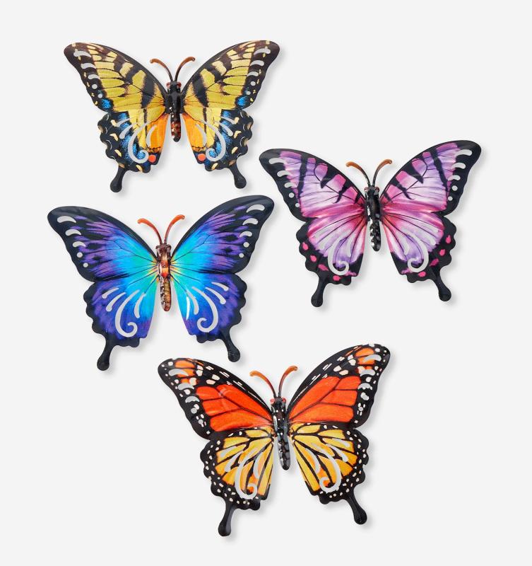 Add dimension, whimsy, and vivid hues to indoor or outdoor spaces with this stunning Metal Butterfly Wall Decor. Beautifully sculpted in the shape of a butterfly, this colorful nature-inspired accent with dazzling motifs will brighten up any bare wall in an instant. Available in 4 assorted styles: Blue, Yellow, Orange, and Purple. Iron.